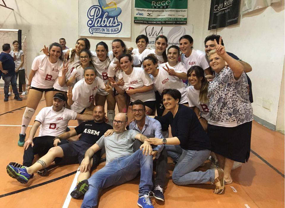 Finalmente può esplodere la grande gioia: la Prisma ASEM Bari supera per 3-0 la Domar Leonessa Altamura e torna dopo un anno in serie B2 nazionale. Dopo lunghi nove mesi di emozioni la formazione di mister Girgenti ha saputo stringere i denti in questi playoff estenuanti conquistando con merito il salto di categoria. Le baresi completano una tripletta stupenda: vittoria del girone, conquista della Coppa Puglia e della promozione. La gara vede partire meglio le murgiane nel primo set, le padrone di casa soffrono ma rispondono colpo su colpo, con Benefico trascinatrice per il 25-17. Nel secondo le baresi partono meglio ma soffrono la reazione della Domar Altamura. Mister Girgenti gioca la carta Masiello, ma Denora è inarrestabile. Bottiglione – terza accoppiata consecutiva promozione e Coppa Puglia per lei- tiene vivo il parziale, Denora va per il primo set point: Calabrese – Russo e la Prisma ASEM Bari ribalta la situazione. Si tratta del set decisivo, le ospiti subiscono il colpo anche psicologicamente, mister Marchisio prova a mescolare le carte ma le ragazze di mister Girgenti vedono l’obiettivo, lasciando solo le briciole alla squadra ospite.