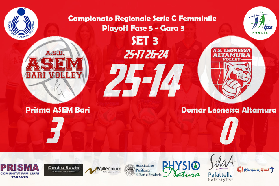 Prisma ASEM Bari 3 – 0 Domar Leonessa Altamura (25-17, 26-24, 25-14)
