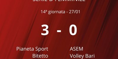 Serie D femminile Risultato 14ª giornata Pianeta Sport Bitetto ASEM Volley Bari Ringraziamo i nostri sponsor– @otticaiurino_valenzano– Noè Recycling Solutions– @pizzaecore_bari #GoASEM