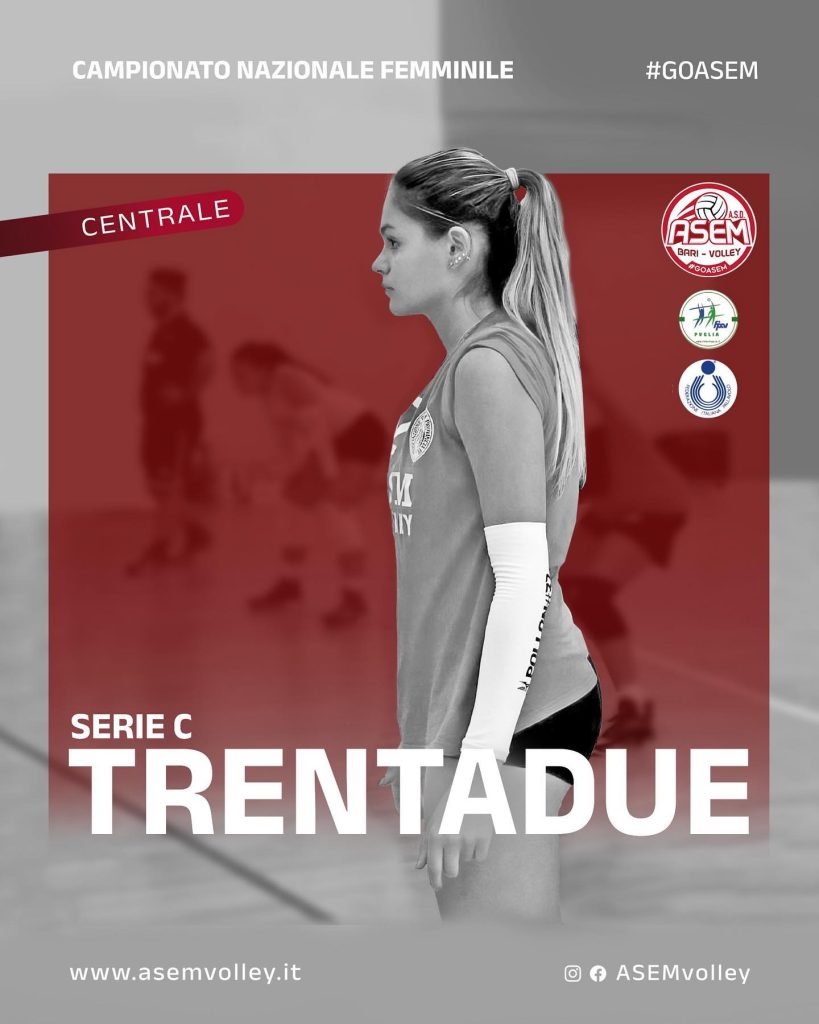 Paola Trentadue – Centrale CONFERMAArriva un’altra conferma nel reparto centrali della Serie C! Anche questo campionato potremo contare su Paola Trentadue, un’atleta di pregio che è ormai una vera certezza per la nostra Società. “Questo è il quinto anno che vesto maglia ASEM e sono molto contenta di essere stata nuovamente riconfermata.Sono pronta ad affrontare questa nuova stagione e sono altrettanto sicura che riusciremo ad ottenere ottimi risultati.Ringrazio il mister…