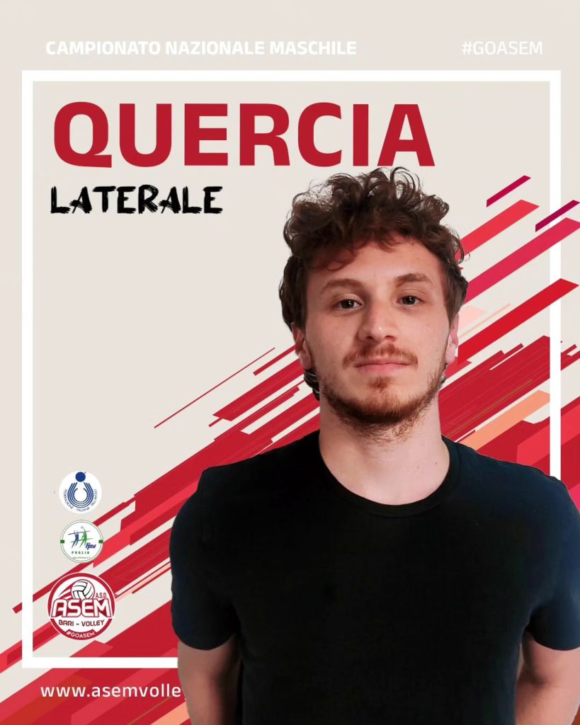Serie D maschile Alfonso Quercia – Laterale New Entry Asem è felice di annunciare l’arrivo di Alfonso Quercia, laterale giovane proveniente dal vivaio dei cugini dell’ Amatori Volley Bari , atleta di notevole interesse che ha già alle sue spalle esperienza di 2 finali nazionali giovanili e da sempre appartenente al gruppo storico dei cugini baresi. “Non vedo l’ora di iniziare questa nuova stagione. Ringrazio il mister e la società…