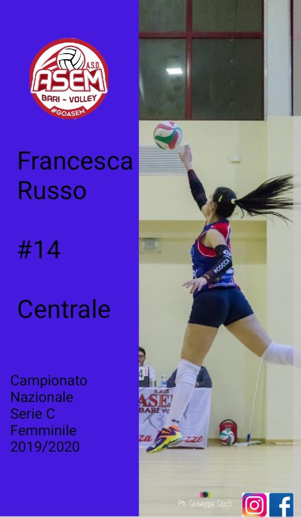 Stiamo parlando di Francesca Russo, centrale, classe ’95. Dopo l’ottimo campionato nella scorsa stagione , terminato con un brutto infortunio al ginocchio, la nostra Cocca, ancora più determinata, decide di vestire per il quinto anno consecutico la maglia Asem, pronta per una nuova stagione, carica di emozione ed adrenalina.