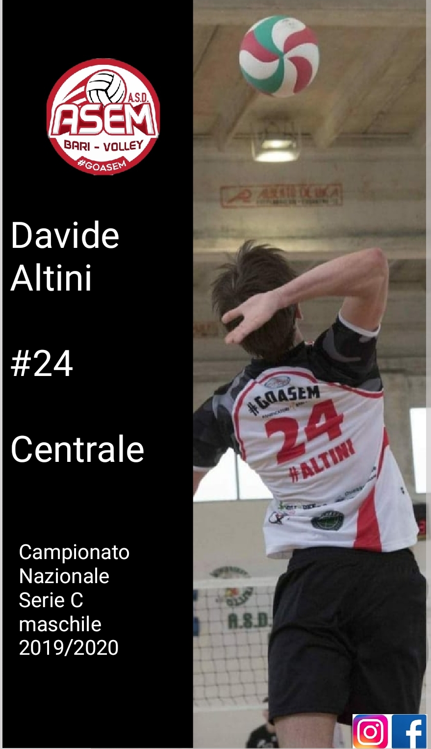 Classe ’96, centrale, nato e cresciuto in casa Asem, disputando tanti campionati giovanili fino ad arrivare alla 1ª divisione. L’anno scorso la società decide di premiare il suo impegno, dando a davide l’opportunità di mettersi i mostra nel campionato di serie D, con atleti bravi ed esperti. Quest’anno, ancora una volta, la società da lui l’ opportinita di crescere e migliorare, inserendolo nel roster di serie C. A lui adesso spetta un duro lavoro fatto di impegno e costanza per emergere in questo campionato duro e complicato.
