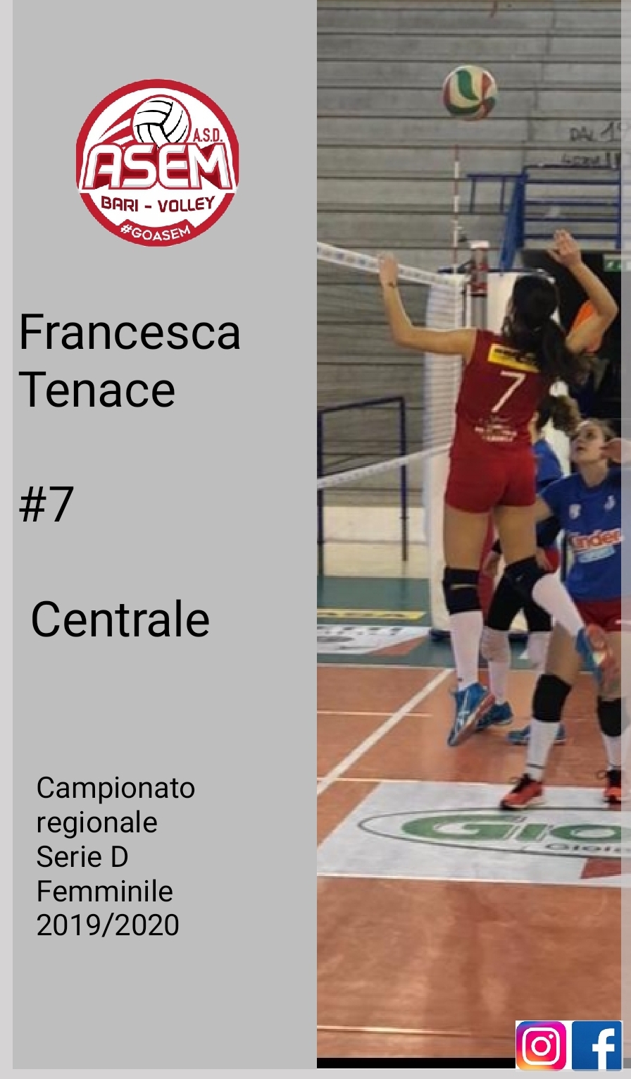 Classe ’98, centrale, Francesca non è un volto nuovo in casa Asem; cresciuta tra le fila dell’Amatori volley, in passato ha già disputato un campionato con la nostra maglia, in collaborazione con la stessa Amatori. L’anno scorso ha partecipato con noi al campionato di 1ª divisione, dimostrando qualità techine, serietà e costanza, proprio per questo la società ha voluto riconfermarla dell’ambizioso progetto di serie D.