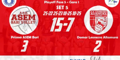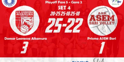 Domar Leonessa Altamura 3–1 Prisma ASEM Bari (20-25, 25-18, 25-18, 25-22) Altamura: Marchisio (4), Orsi Toth (12), Nanocchio (15), Facendola (12), Denora (16), Nuzzi (4), Moramarco (L1)(1), Rizzi (L2), Giorgio (ne), Fanelli (0), Lorusso (ne), Di Tommaso (ne) all. Claudio Marchisio – vice all. Vita Simone Bari: Marzano (2), Calabrese (5), Benefico (9), Tritto (10), Bottiglione (13), Russo (5), Bozzetto (L1), Milella (0), Masiello (1), Scarabino (ne), Zippo (ne), Gambacorta…