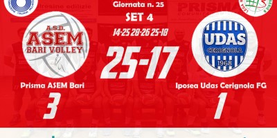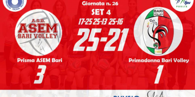 Finisce nel migliore dei modi la stagione della Prisma ASEM Bari, vincente in quattro set sul campo del già retrocesso Tricase. Va così in archivio una stagione indimenticabile per il sodalizio del presidente Leandro, partita con il ripescaggio di Agosto e culminata con uno splendido quinto posto. Prima stagione in B2, nell’ultima prima della fusione della quarta serie con la B1, e subito i baresi hanno staccato con largo anticipo…