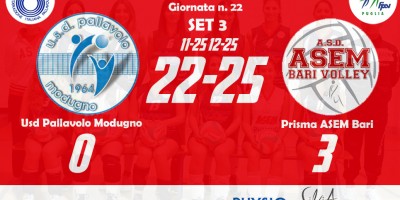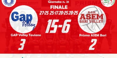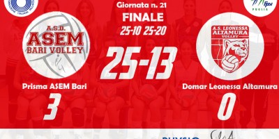 Prisma ASEM Bari 3–0 Domar Leonessa Altamura (25-10, 25-20, 25-13) Bari: Marzano (2), Calabrese (11), Benefico (12), Tritto (7), Bottiglione (14), Russo (7), Bozzetto (L1), Milella (ne), Masiello (ne), Scarabino (ne), Zippo (ne), Gambacorta (L2)(ne). all. Alessandro Girgenti Altamura: Marchisio (3), Lorusso (0), Facendola (4), Nanocchio (1), Nuzzi (4), Denora (8), Moramarco (L1), Rizzi (L2), Orsi Toth (5), Fanelli (1), Giorgio (0), Baldassarra (ne), Di Tommaso (0). all. Claudio Marchisio…