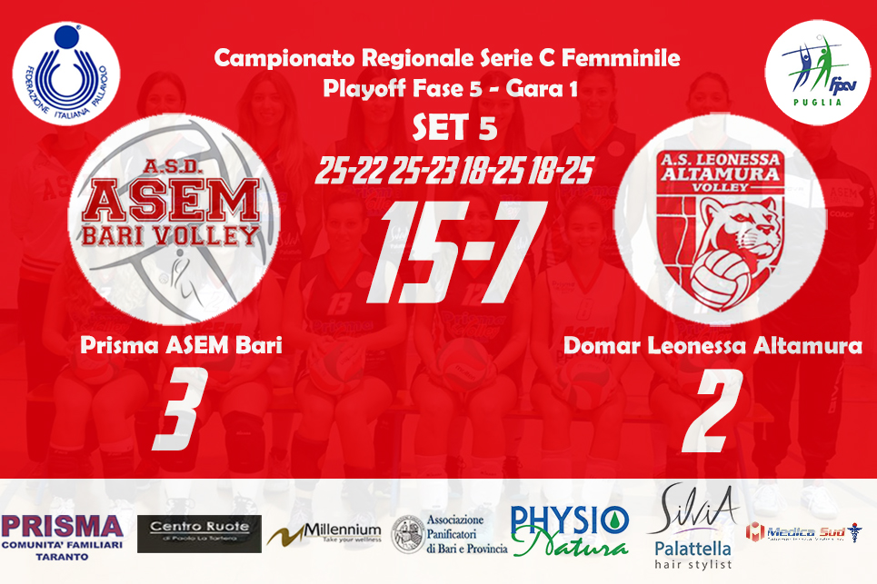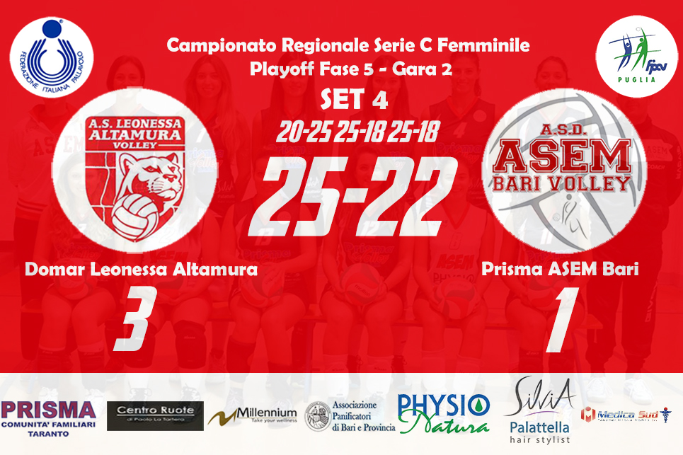 Domar Leonessa Altamura 3–1 Prisma ASEM Bari (20-25, 25-18, 25-18, 25-22) Altamura: Marchisio (4), Orsi Toth (12), Nanocchio (15), Facendola (12), Denora (16), Nuzzi (4), Moramarco (L1)(1), Rizzi (L2), Giorgio (ne), Fanelli (0), Lorusso (ne), Di Tommaso (ne) all. Claudio Marchisio – vice all. Vita Simone Bari: Marzano (2), Calabrese (5), Benefico (9), Tritto (10), Bottiglione (13), Russo (5), Bozzetto (L1), Milella (0), Masiello (1), Scarabino (ne), Zippo (ne), Gambacorta…