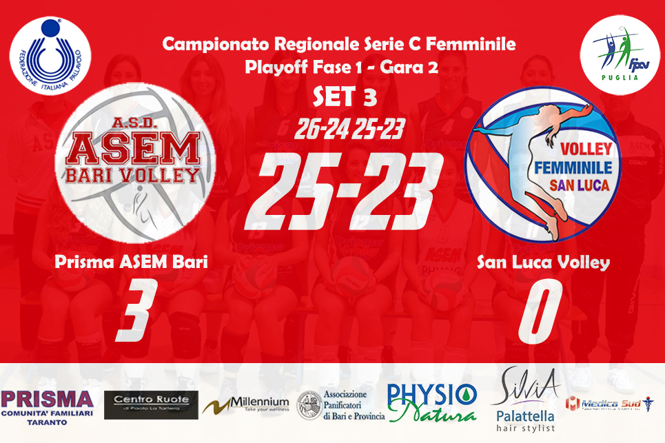 Prisma ASEM Bari 3–0 San Luca Volley (26-24, 25-23, 25-23) Bari: Marzano (0), Calabrese (6), Benefico (11), Tritto (13), Bottiglione (14), Russo (5), Bozzetto (L1), Milella (0), Masiello (ne), Scarabino (ne), Zippo (ne), Gambacorta (L2) all. Alessandro Girgenti – vice all. Luciana Girgenti San Luca: Felline (0), Greco (12), Zicari (11), Romano (10), Martucci (7), Barba (6), Trande (L), Stefanelli (0), Parisi (0), Morciano (ne), De Marco (ne), Lazzari (0)….
