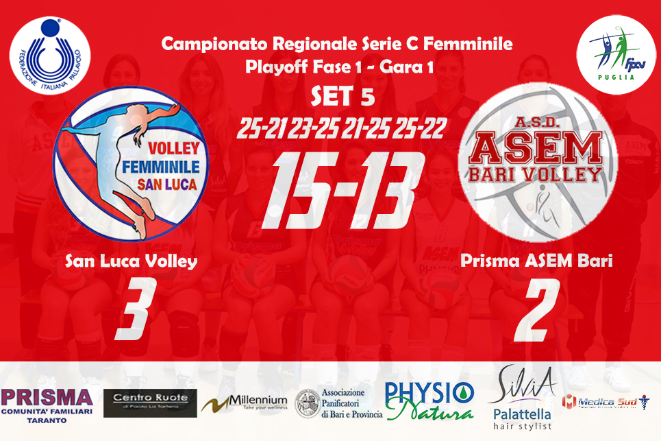San Luca Volley 3–2 Prisma ASEM Bari (18-25, 25-22, 19-25, 25-22, 15-12) San Luca: Felline (1), Greco (14), Zicari (23), Romano (23), Barba (6), Martucci (12), Trande (L), Stefanelli (1), Morciano (ne), Parisi (0), De Marco (ne), Lazzari (0). all. Elio Quarta – vice all. Enrico Quarta Bari: Marzano (0), Calabrese (12), Benefico (22), Tritto (19), Bottiglione (16), Russo (5), Bozzetto (L1), Milella (0), Masiello (ne), Scarabino (ne), Zippo (ne),…