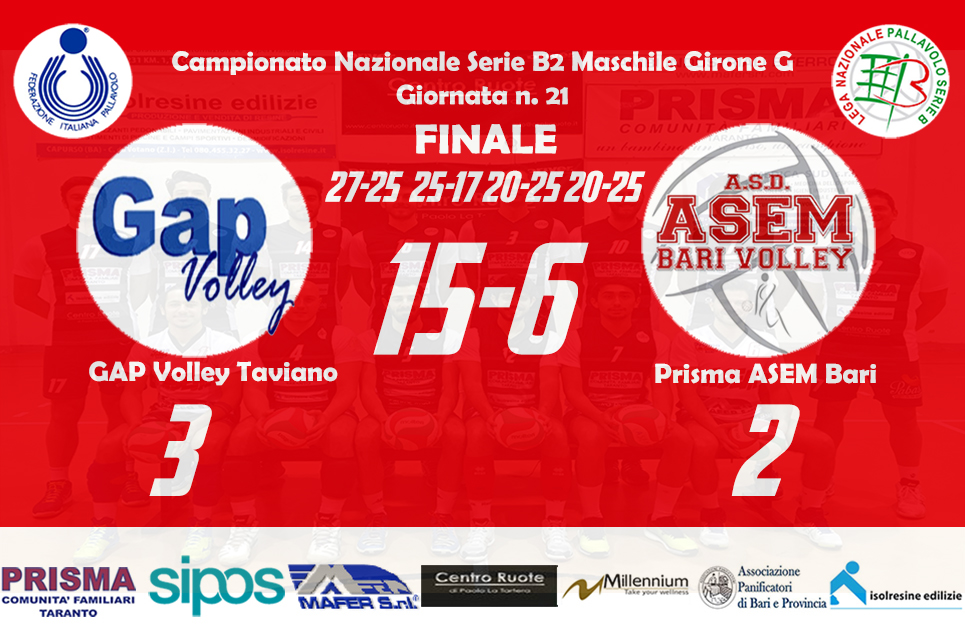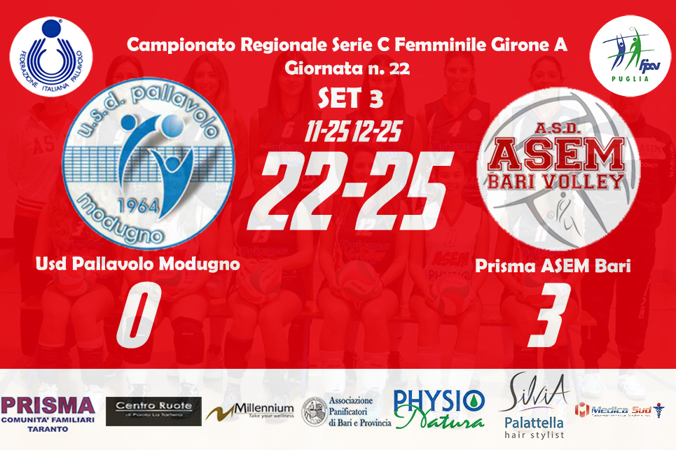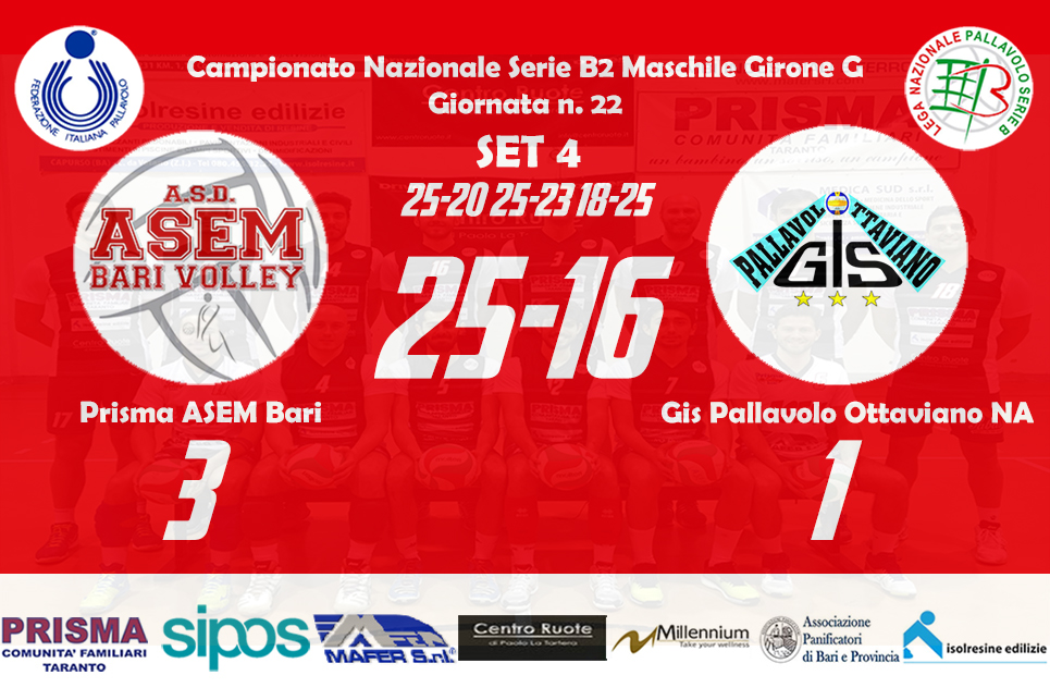 Prisma ASEM Bari 3–0 Domar Leonessa Altamura (25-10, 25-20, 25-13) Bari: Marzano (2), Calabrese (11), Benefico (12), Tritto (7), Bottiglione (14), Russo (7), Bozzetto (L1), Milella (ne), Masiello (ne), Scarabino (ne), Zippo (ne), Gambacorta (L2)(ne). all. Alessandro Girgenti Altamura: Marchisio (3), Lorusso (0), Facendola (4), Nanocchio (1), Nuzzi (4), Denora (8), Moramarco (L1), Rizzi (L2), Orsi Toth (5), Fanelli (1), Giorgio (0), Baldassarra (ne), Di Tommaso (0). all. Claudio Marchisio…